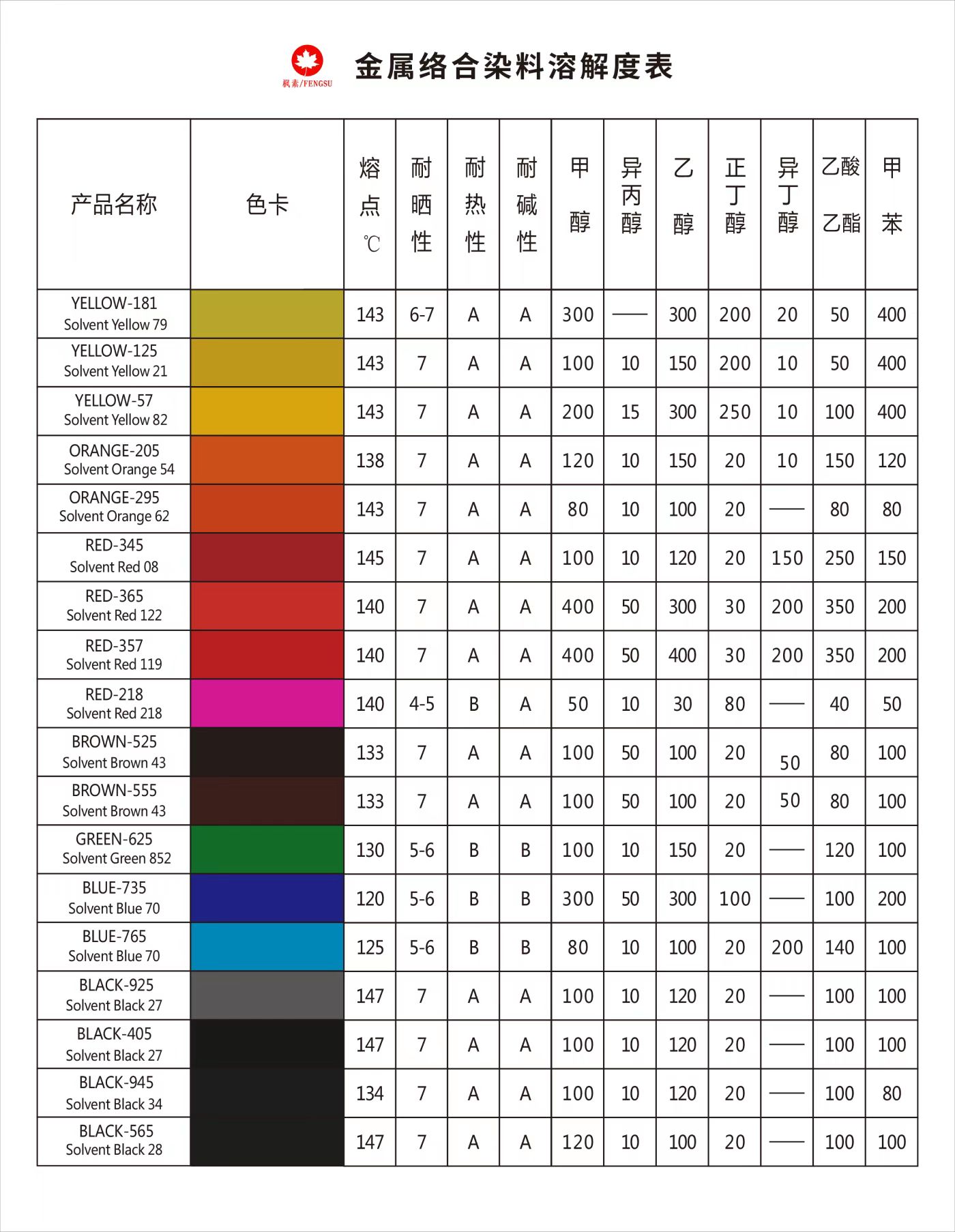 楓素系列金屬絡(luò)合染料是---種可以用溶劑溶解的染料,其絡(luò)合結(jié)構(gòu)使之有別于--般的有機(jī)顏料及傳統(tǒng)型偶氮染料,金屬絡(luò)合染料具有更高的光澤度及透明性,更好的耐候性,堅牢度。與無機(jī)顏料相比,金屬絡(luò)合染料更有分散易、滲透性強(qiáng)、顏色鮮艷之特性。金屬絡(luò)合染料色精的標(biāo)準(zhǔn)濃度為30%,水性為25%,全系列產(chǎn)品均為凈味、鮮艷、高透明。